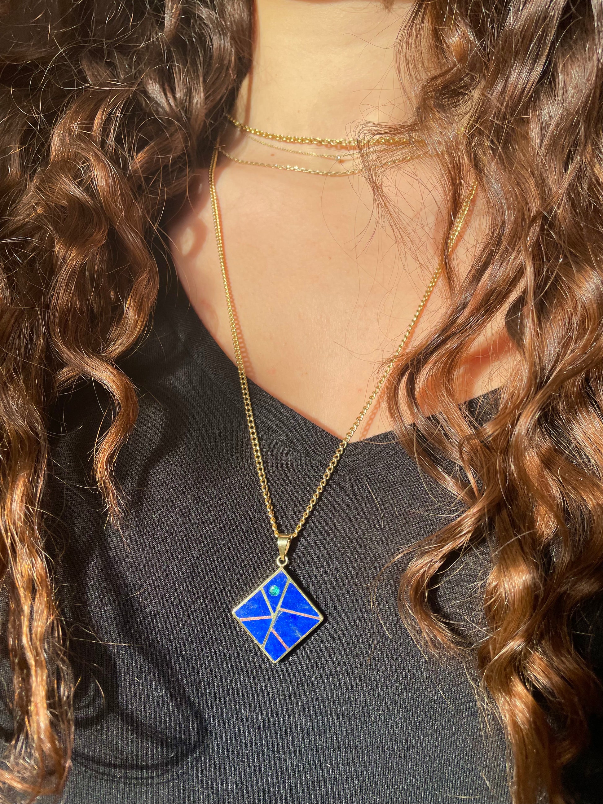 Chic, elegant, delicate, handmade, designed by Oriane Zerah made by Milad Zamani in Afghanistan, this pendant in Lapis Lazuli, gold-plated brass, copper, and adorned with an Emerald is one of the new pieces of Azal by Oz. Lapis Lazuli comes from the mines of Badakhshan, the emerald from those of Panjshir. Blue, green, gold and copper come together with finesse.