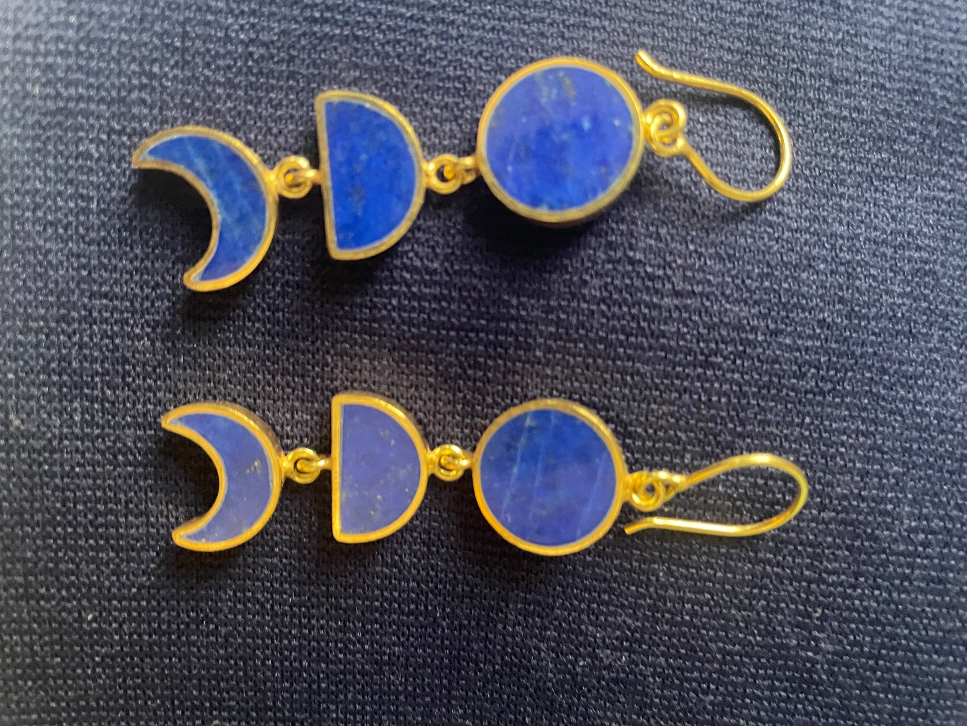 Spogmai is the pashto word for moon, Mah is the persian one for it. Waxing, waning, changing, the moon is associated with emotions: in the same way that it influences the tides, it would act on our temperament, our moods and our impulses. Moon-Mood is the latest piece created by Azal by Oz. Delicately crafted in lapis lazuli and gold-plated brass. Designed by Oriane Zerah, and Handmade in Afghanistan by Milad Zamani.